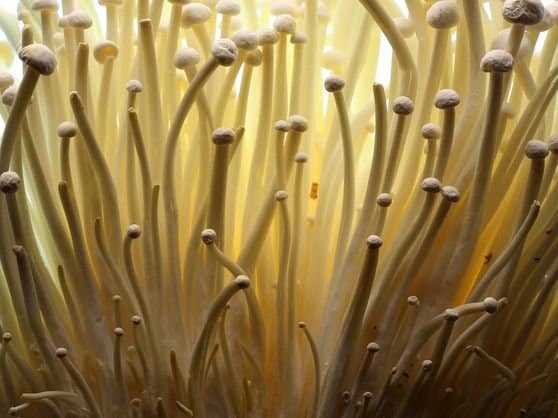 If grown in logs, Enoki grows like a white oyster (oyster shell-shaped) instead of a thin, long strand that we are used to seeing.
